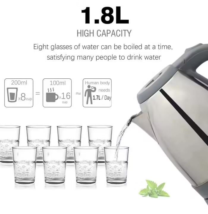 Chauffe Eau électrique / Bouilloire électrique sans fil 1500W, 1,8 Litres, en acier inoxydable.